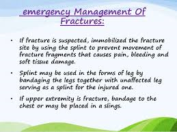 The initial management of fractures consists of realignment of the broken limb segment (if grossly deformed) and then immobilizing the fractured extremity in a splint. The distal neurologic and vascular status must be clinically assessed and documented before and after realignment and splinting. If a patient sustains an open fracture, achieving haemostasis as rapidly as possible at the injury site is essential; this can be achieved by placing a sterile pressure dressing over the injury site.